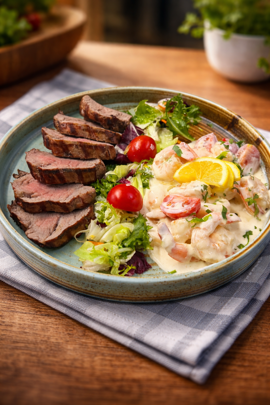 – muschi vita, creveti decorticati, smantana, lamaie, salata verde, otet balsamic, miere