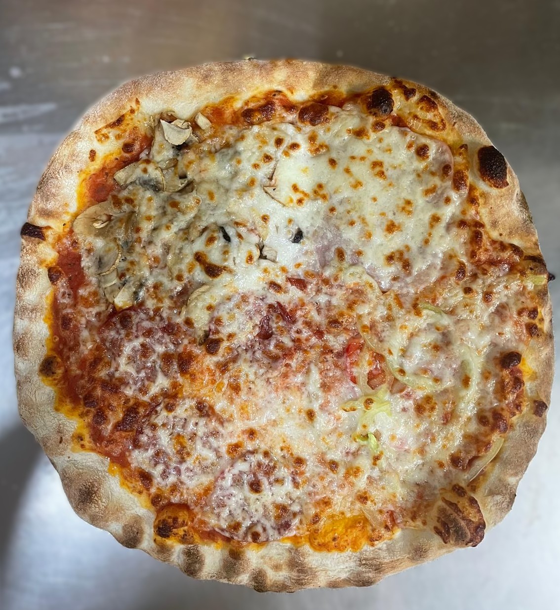 sos de rosii, mozzarella, ardei gras, salam, sunca, ciuperci, oregano