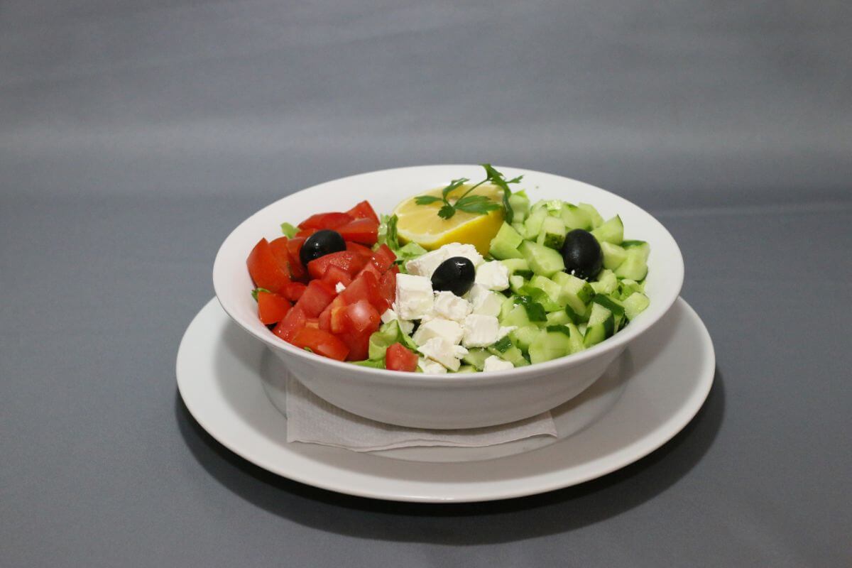 salata verde, rosii, castraveti, masline, branza feta, lamaie, sare, piper .